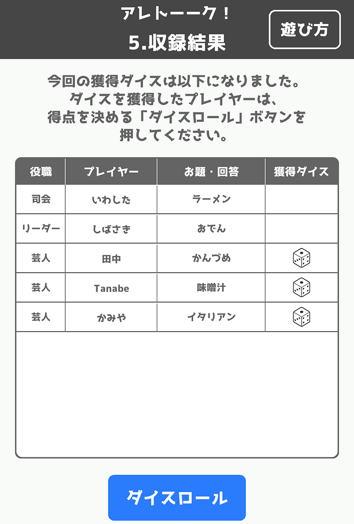 ダイスを獲得したプレイヤーのみ、「ダイスロール」ボタンを押し、今回の収録の得点を決めます。
