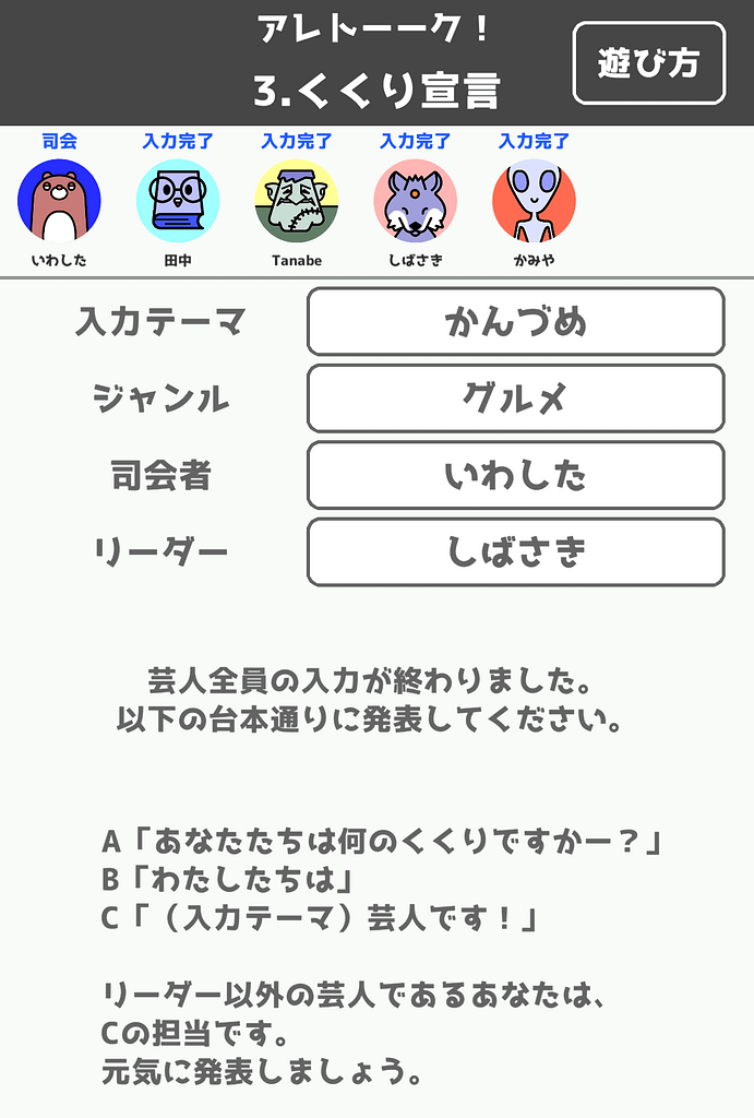 芸人全員が推測したテーマを入力し、くくり宣言をします。アプリ内の台本に従って、「私たちは〇〇芸人です!」とはっきり宣言しましょう。