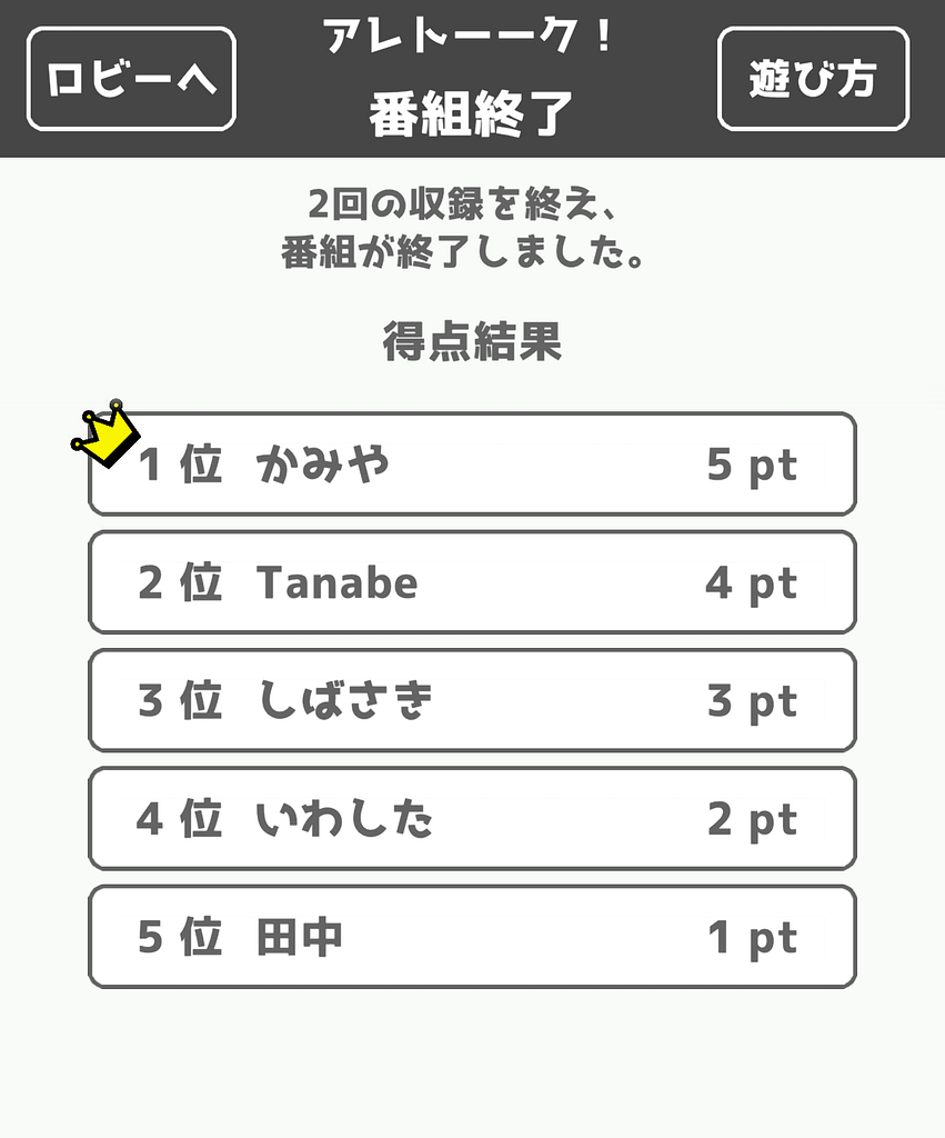 ひとりずつ司会をしていき、すべてのプレイヤーの司会が終わったとき、点数が最も高かった人が優勝です。