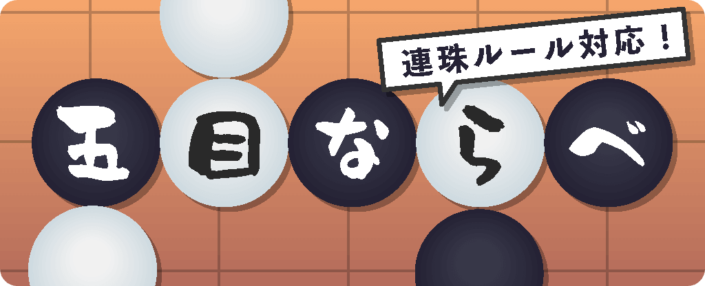 五目並べがどこパに登場!シンプルなのに奥深い、読み合いと戦略のゲームです。5つ並べれば勝ちの定番ボードゲーム。細かい設定が可能で、上級者のガチ対局から初心者のカジュアル対戦まで幅広く楽しめます。どこパでは「連珠」の公式ルールでも遊べます。